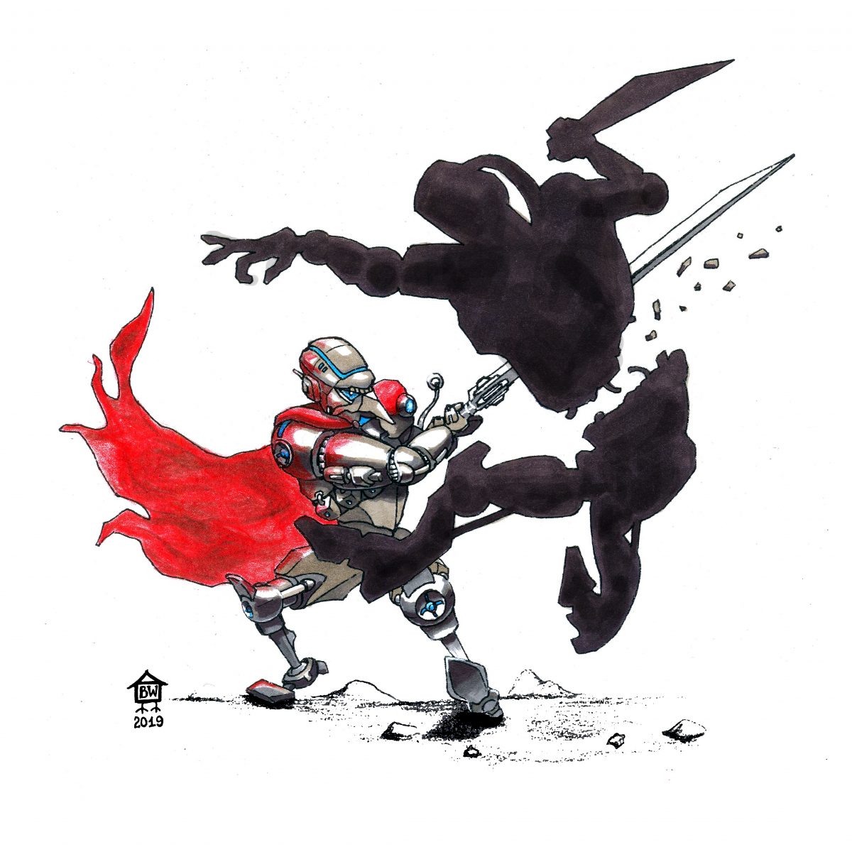 Will and I found ourselves tagged in this picture on Instagram. Andrew (his email actually has his name in Russian/Cyrilic, but he signed the email with Andrew, so I’m using that instead of Andrei) posts a lot of robot and alien art on his IG account, and when he posted this, he described it as an homage to our little labor of love. Again, he gets mad points for the nose and the chin on his robot Hunter.
