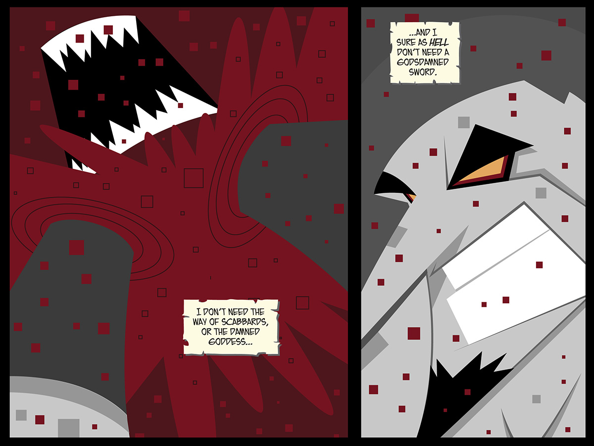 This is actually the second version of the page. In the original version of the page, Panel One was even more abstract, so much so that I couldn’t be abundantly sure what was happening in the image…and I wrote it. I communicated this to Will, and he came back with this utter beauty. Panel One reminds me of stuff from Elektra: Assassin, and if your work reminds me of the combined efforts of Frank Miller and Bill Sienkiewicz, then you’re doing something right.