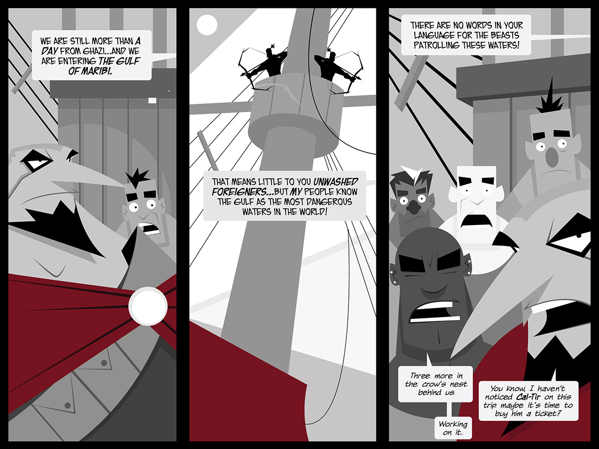 The Gulf of Maribi is a completely original name. Usually, the fictional locations in the Known World have some sort of gaming antecedents or literary inspiration, but this time, I just wanted a place that worked with for a fictional land inspired by Africa. (Khozi’s tattoos come from a similar place, I think.)
