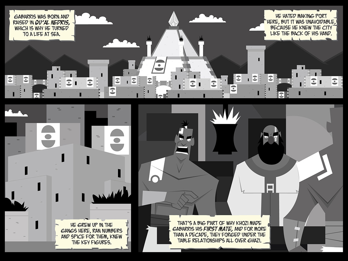Just to be clear…Ghazi is the name of both a nation and a continent, kind of like Australia. Qu’al Nedris is a city in Ghazi, the port city where Hunter and Jasoom brought Cerulean Skies to make berth. It’s a place that remains largely unknown to the people of Kavenassa and Kur, but was “discovered” by the Sovran Twins after they escaped the Hell Pyramid years back. Since then, the Sovrans have rebuilt Double Heads, their criminal organization, into a formidable force, and now they’re trying to have a foothold in the underworlds of three continents. This is where the Black Ribbon has fled to, and where Hunter Black is pursuing her. (Hey! I don’t think I’ve ever done a recap here before!)