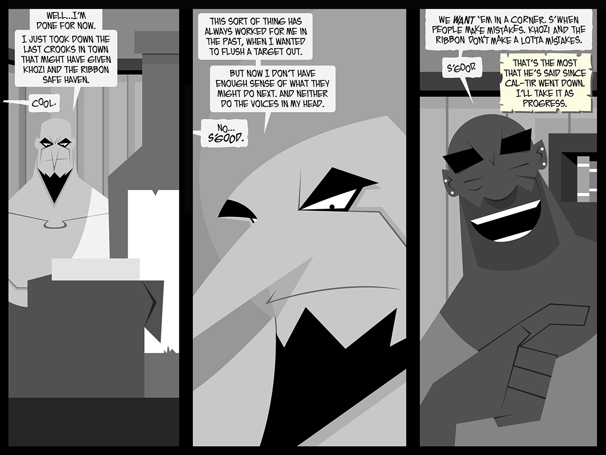 This is how Hunter behaves when he’s trying to be a good friend. He thinks that by getting Jasoom to focus on the task at hand, never mind the fact that it’s Hunter’s task and not Jasoom’s, he’s taking Jasoom’s mind off of the situation with Cal-Tir. Hunter would never wade into Jasoom’s drama by choice; that’s just not in his nature.