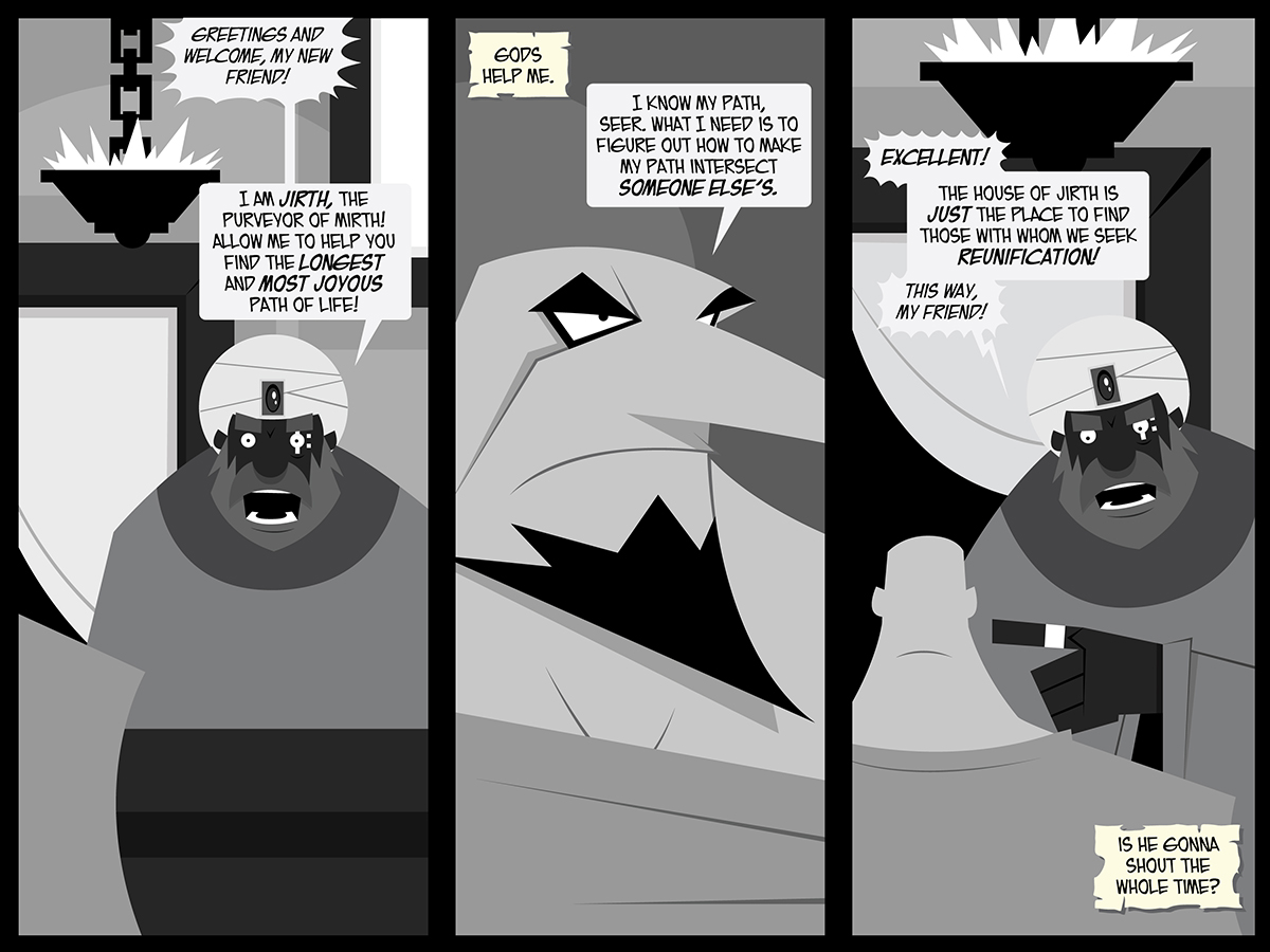 There’s kind of a disconnect with what I wrote for Jirth and what Will drew, but I love what Will drew, so I decided not to worry. I wanted Jirth to come off as jolly, but I think he seems a bit more…intense than that. It works though.