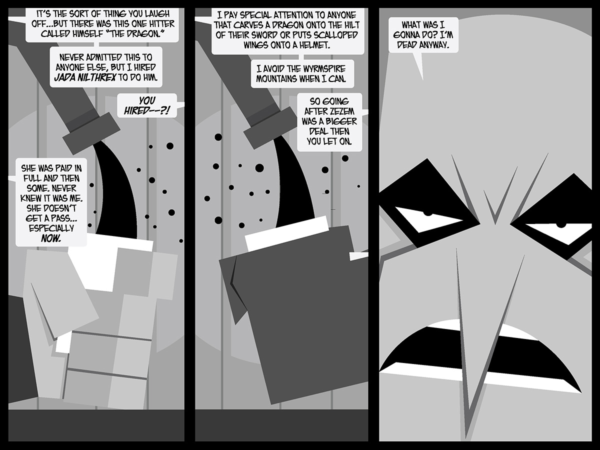 One of my favorite things about doing this comic is writing words like “hitter,” words that are very specifically mainstays of crime fiction, into this fantasy setting. The fantasy elements of the comic come VERY easily to me. Wizards, magic, monsters…that stuff is my bread and butter. I’ve been wading through D&D, Tolkien, Eddings, Howard, and so on, my whole life. I came to noir much later in life, and I have almost no literary background in it. I’ve never read the masters of the field, including Richard Stark/Donald Westlake, whose Parker is probably the biggest single influence on our main character. My interaction with the character comes solely from Darwyn Cooke’s adaptations.