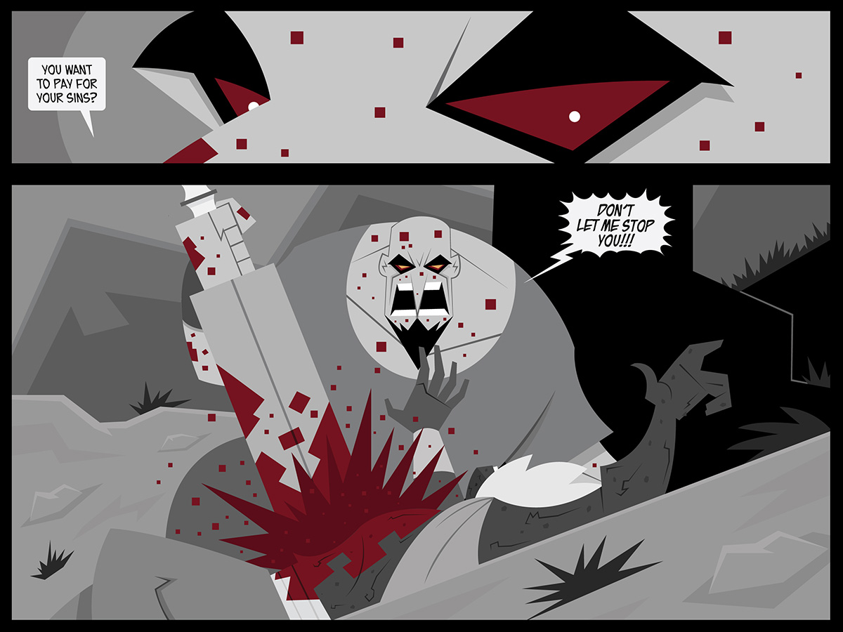 It’s not often that I feel the need to issue a clarification, but I’m not abundantly sure we’ve sold what’s going on. Hunter is terribly injured. His spine is fractured and he’s only injuring himself further in an effort to take out Voutros. (Sometimes, I notice things too late to get them fixed in time.)