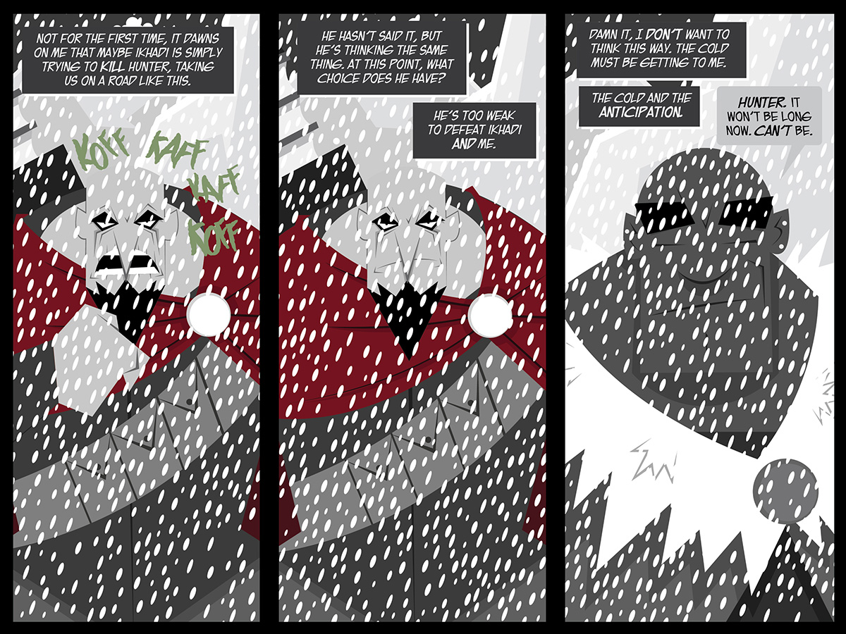 I am reminded of an issue of the old Giffen/DeMatteis/Maguire Justice League, where Batman refuses to put on a parka…or even SHIVER…in the Russia tundra. Hunter, you need to put on a jacket.