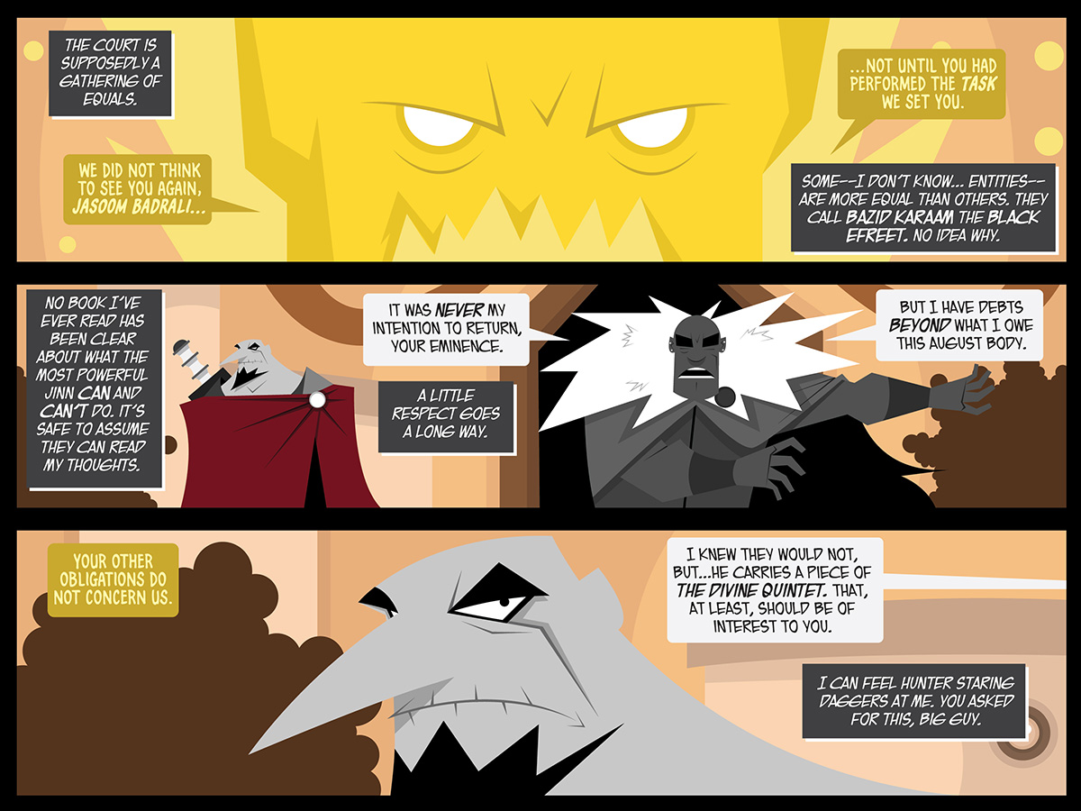 Hunter Black Page 1297 – You Asked For This ⇦ Hunter Black Page 1296 – The Court Of The Jinn Hunter Black Page 1298 – Keep Your Temper ⇨ Sometimes I think that Will and I should develop a Fantastic Four animated series. Anyway. Facebook Comments Tagged Bazid Karaam, Hunter Black, Jasoom Badrali, The Court of The Jinn, The Lands of The Jinn.