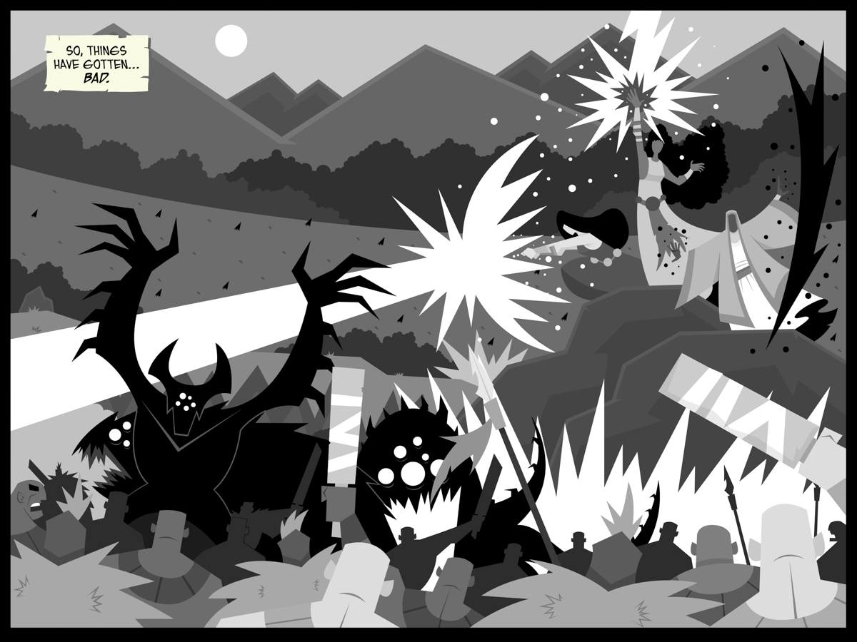 This is one of those moments where Will took my simple page description and WENT OFF. This is literally all that I wrote: “This is a big shot of Church forces battling Aeryn Thornheart, Sothronia Adal, and Kaïna Raim just on the Garden side of the Hedge Wall, which has had a large hole burned into it. Shadow monsters abound.”