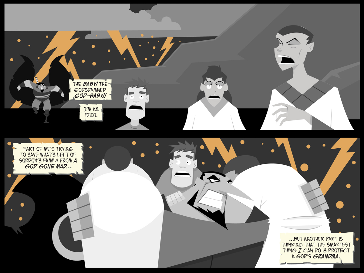 It’s important to remember, even as Hunter Black chastises himself for failing to realize that his son was a god, that the characters see their world in full color, not in the shades of gray we present to you all.