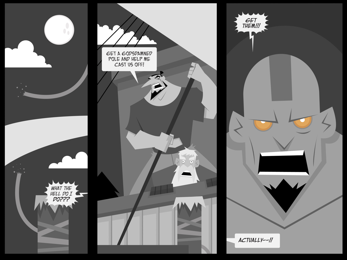 Hunter Black Page 1751 – What The Hell Do I Do? ⇦ Hunter Black Page 1750 – The Barnacle Hunter Black Page 1752 – On Your Own ⇨ Hunter’s little top-knot/man-bun is really cracking me up. Facebook Comments Tagged Brother Bashan, Hunter Black, Stilts, The Constable, The Human Divine, Tilios Da..