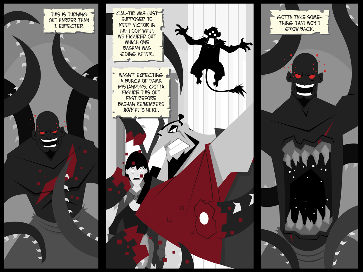 Sometimes, I just let Will do his thing. My only panel descriptions for Panels One and Three were, “Brother Bashan, but even more monstrous than before.” (I’m paraphrasing.) Damn it, I still haven’t sit down to rewatch John Carpenter’s The Thing. I really want to now.