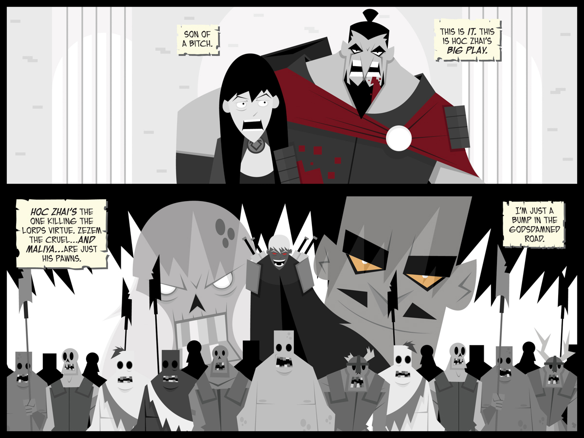 Ahhhh…there’s something deeply satisfying about an inner monologue panel where we get to see the comic’s biggest bads together. The weird thing is, I don’t think we’ve ever shown Zezem the Cruel’s face since he died except in Hunter’s imagination. So far, we’ve only shown him peering out from under his hood.