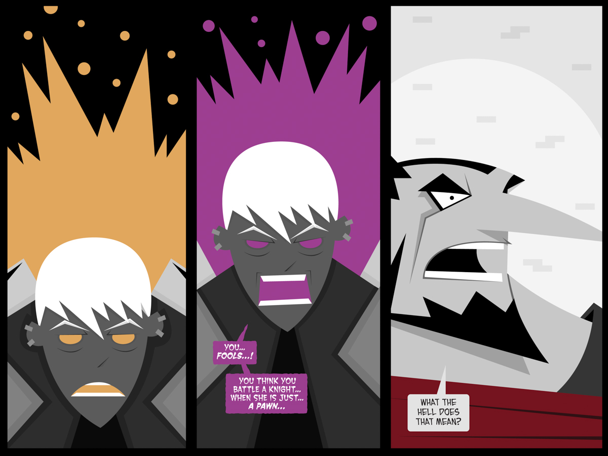 It’s not often in this comic that I get to tap into my horror movie sensibilities, but that’s definitely what I was going for in that second panel. I wanted you to hear a voice different than Maliya’s and I think Jacob achieved that. The new color — which definitely was not my first choice — also signals that something different is going on. (Of course I’m not going to say what that is!)