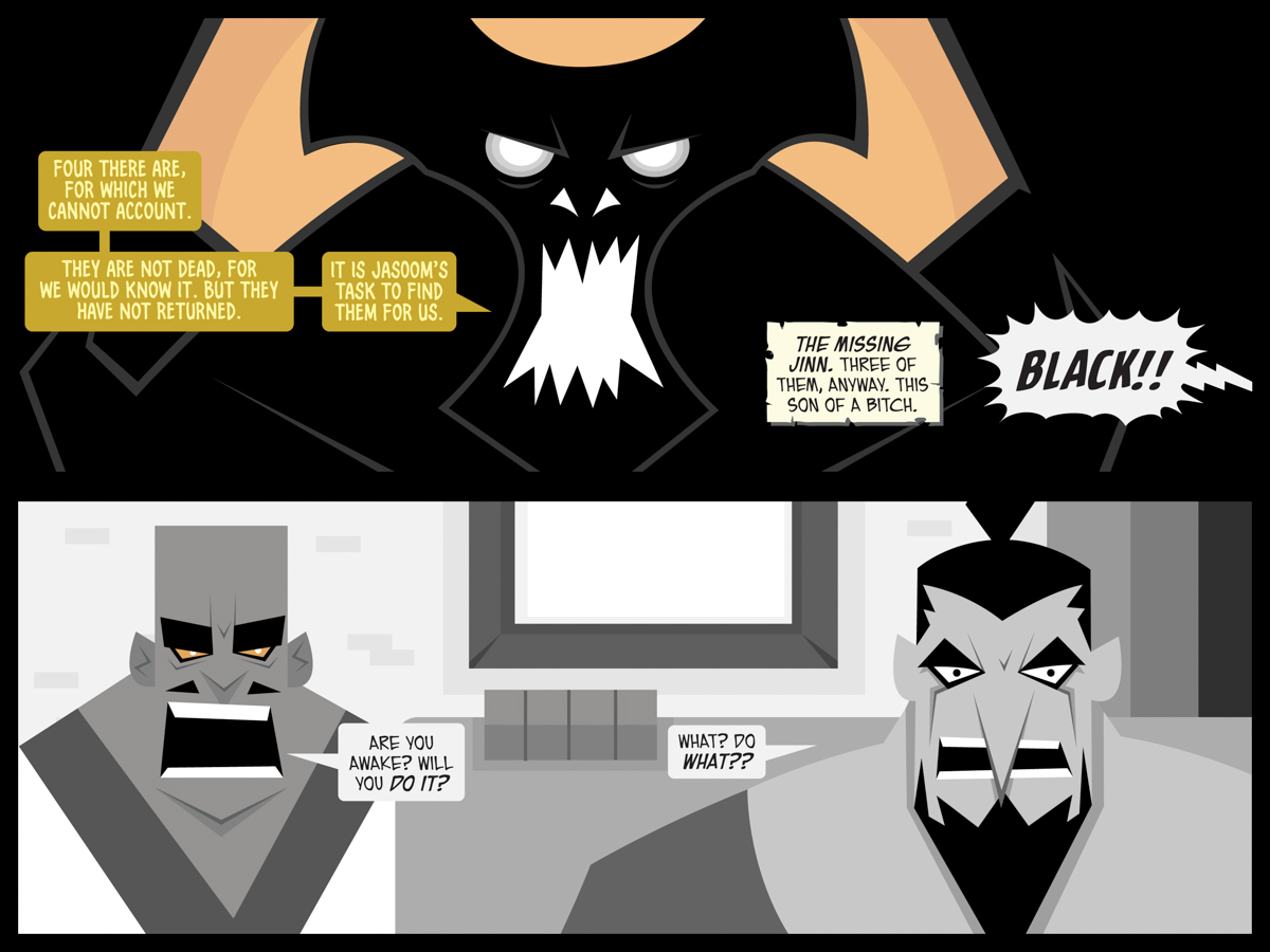 The top panel is a flashback to the leader of the High Council of the Jinn – Bazid Karaam, the Black Efreet. I originally created this character for another project entirely, one that never got fully off the ground. Bazid Karaam was never more than a character profile that I wrote. (The project was about myths and mythology — a cool djinn was perfect for it.) His first appearance in Hunter Black was here.