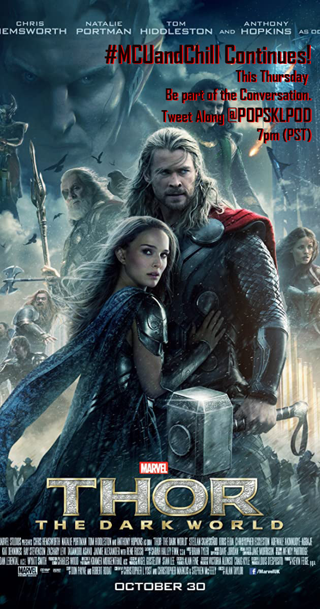 The #MCUandChill train just keeps chugging along. This Thursday, April 15th, at 7:00pm PST, the POPSKL Podcasters (of whom I am a member) will be LiveTweeting as we watch Thor: The Dark World. This is probably the most maligned film in the MCU, so it should be a good time. Follow us on Twitter @POPSKLpod or just click the image above…and look for the #MCUandChill hashtag.